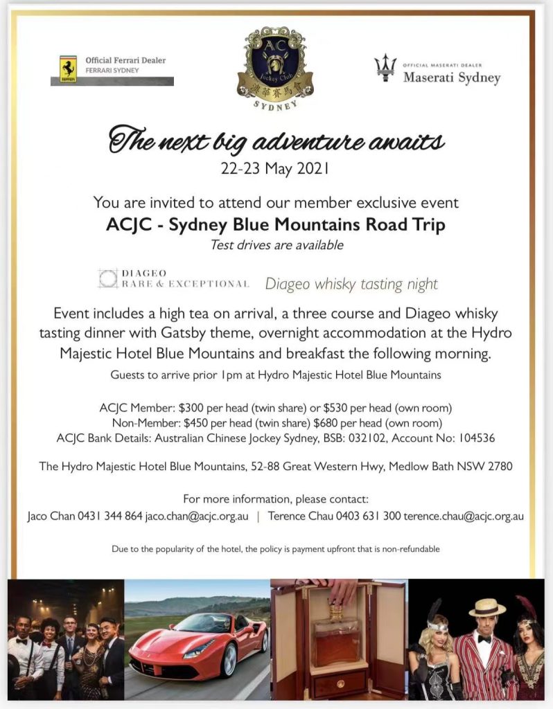 Thanks for the support of Ferrari Sydney & Masarati Sydney. ACJC Sydney Blue Mountains road trip. High Tea at the beautiful Hydro Majestic Hotel. 澳洲悉尼華人赛馬會周末藍山行.