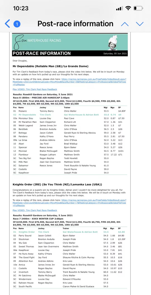 Congratulations to all The ACJC Million Dollars Club owners & ACJC members. Our horse Knights Order finished 1st & won the Winter Cup, also Mr Dependable finished 2nd in other race at Rosehill Garden today. What a fantastic results! 我們的兩匹馬今天在Rosehill 出賽,均取得好成績,Knights Order 贏得了$150000奬金的Winter Cup, Mr Dependable也在另一場賽事取得第二名,可喜可贺