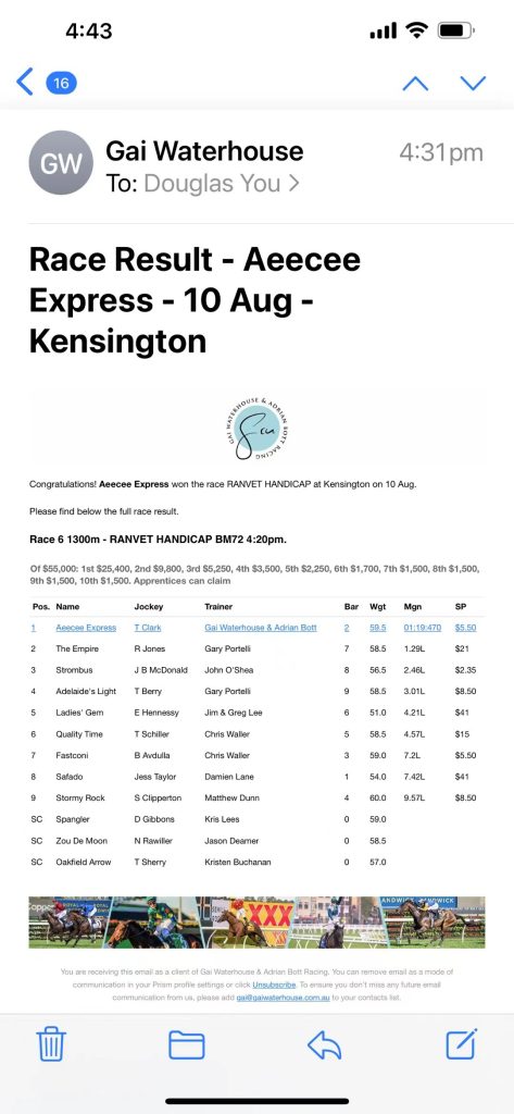 angela August 10, 2022 News & Updates Aeecee Express Wins at Randwick Our horse Aeecee Express had a great run & finished 1st at Randwick today. Thanks our trainer Gai Waterhouse & Adrian Bott, Jockey Tim Clark. Well done.