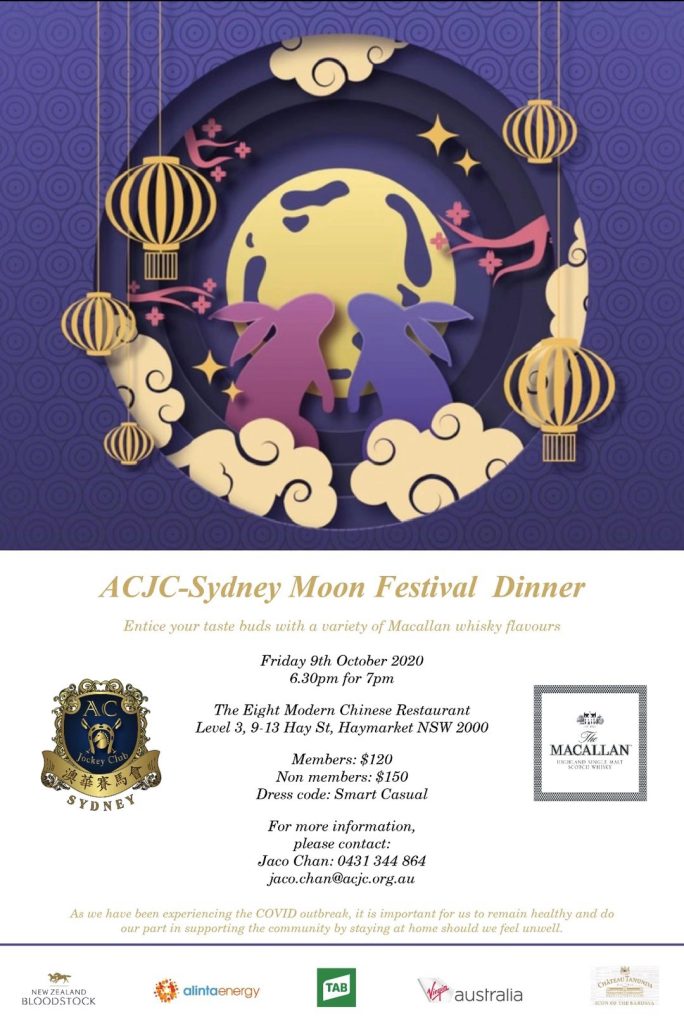 angela October 10, 2020 Recent Events ACJC Sydney Moon Festival & Macalian Whiskey Tasting Dinner ACJC Sydney , Moon Festival & Macalian Whiskey tasting Dinner. Full of fun😁. 澳洲悉尼華人賽馬會中秋聯歡和著名蘇格蘭Macalian 威士忌🥃品尝晚宴. 好酒好菜,充滿了歡樂的氣氛,大家都盡興而歸👍👍👍