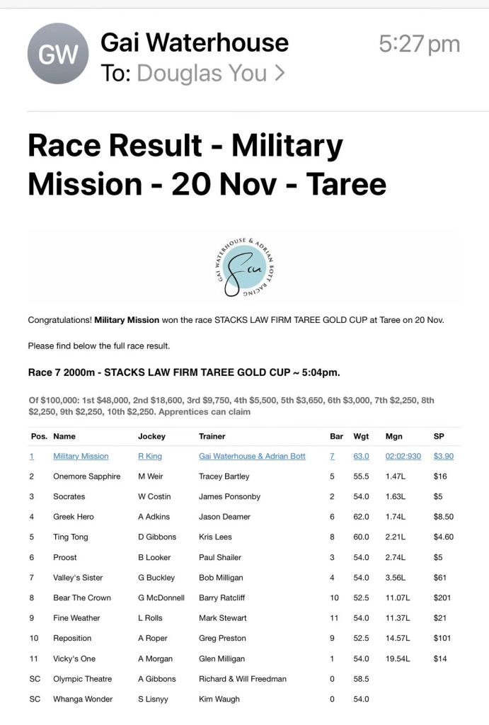 Today, at Taree, Military Mission was ridden by jockey Rachel King and scored its most significant win to date, getting the money in the $100,000 Taree Gold cup. Thanks our Trainer Gai Waterhouse & Adrian Bott, Military Mission has managed to win 4 races in its career so far.