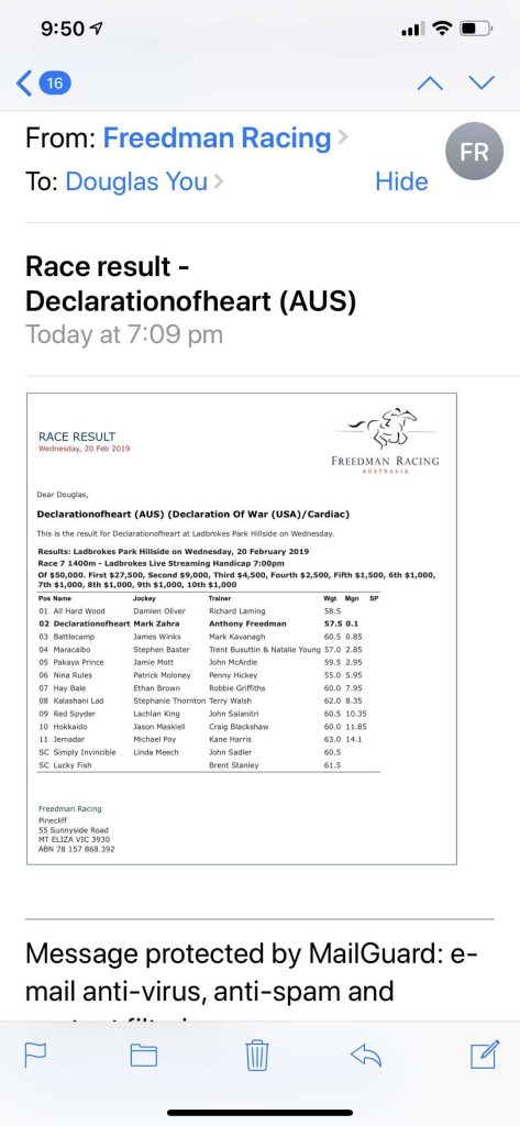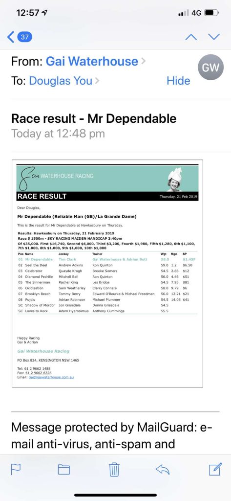 angela February 22, 2019 2020, News & Updates Two Good News in One Day Two happy days with our horses. Mr Dependable finished first in Hawkesbury today & Declarationofheart finished second in Ladbrokes Park Sandown yesterday . 我们的馬连续两天有好成绩,Mr Dependable 今天跑第一,Declarationofheart 昨天跑第二.👏👏👏